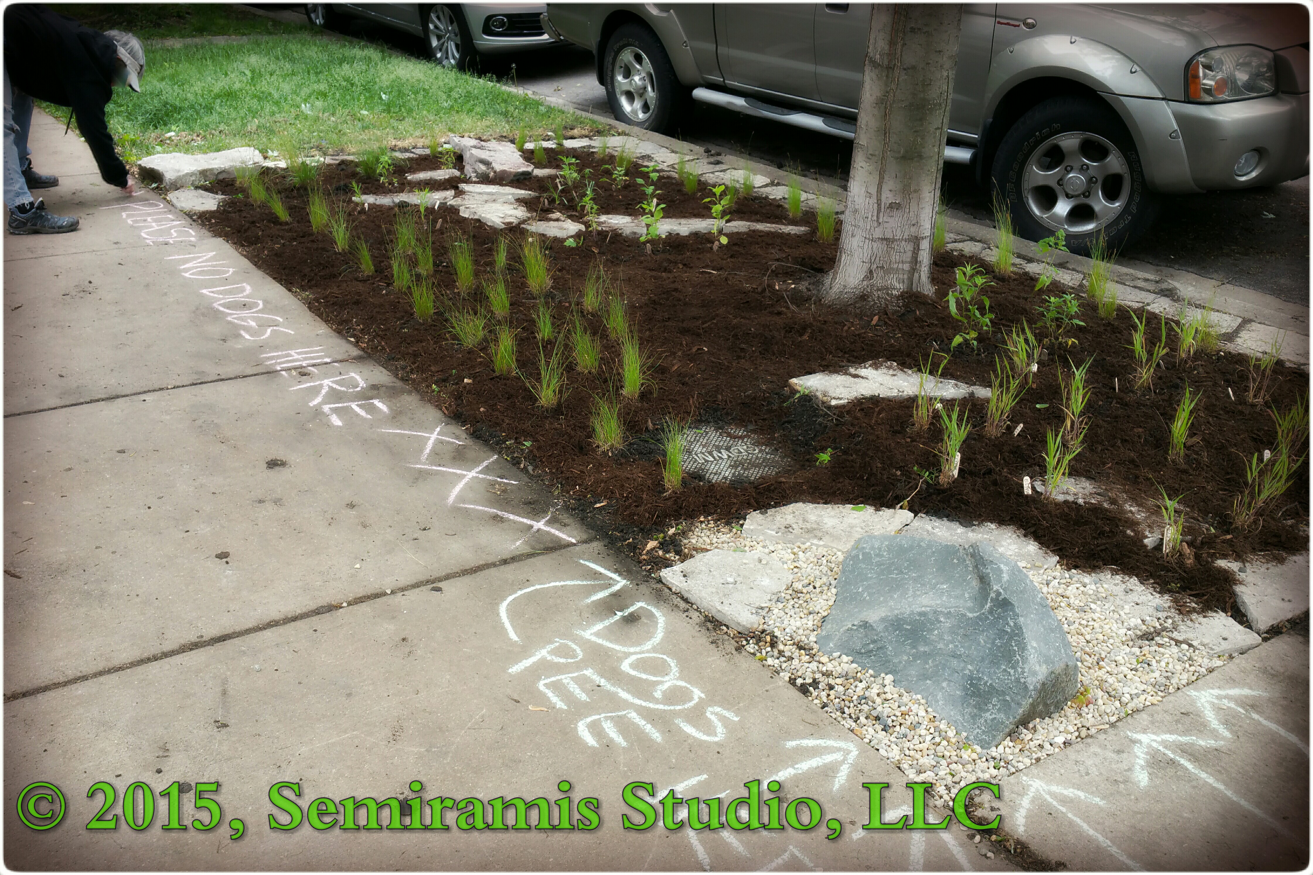 The Studio designed this parkway for a residential client. The dog owners are encouraged to allow the dogs to mark the rock, not the tree.